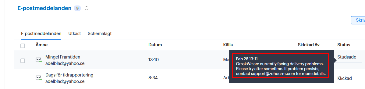 Om ett mail studsar blir adressen låst för framtida utskick från Zoho CRM oavsett om orsaken till studsen åtgärdas eller ej. Då behöver vi felanmäla det till CRM-supporten support@eu.zohoone.com .